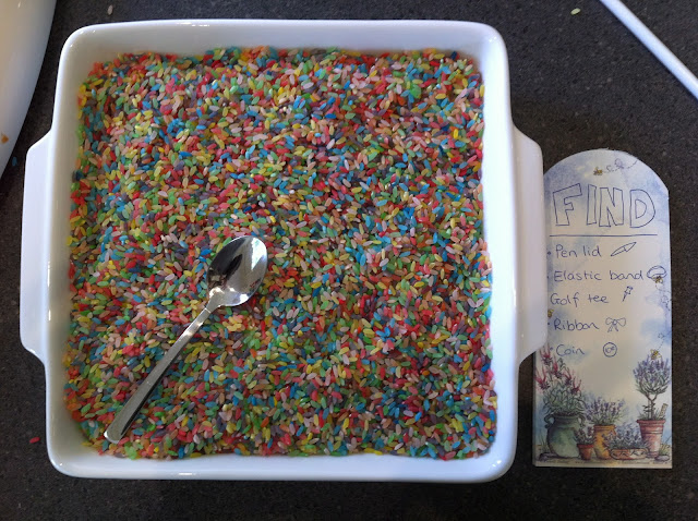 You could hide some small objects within the rice and provide your little one with a checklist and spoon for discovery.