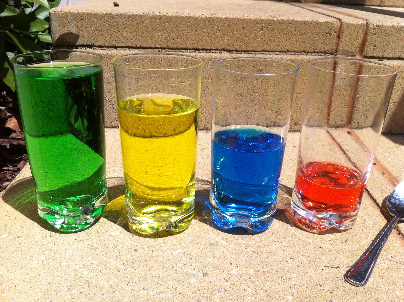 I was quite mathematical about it because I wanted them all to be of similar shades, however, if I was to add say 5 drops to all of the glasses I would have a considerably dark colour in the one that had the least amount of water. So this is something you could discuss with your child and problem solve the solution. For me, I added 1 drop of colouring to the glass with the least amount and increased a drop with each glass as the volume of water increased.